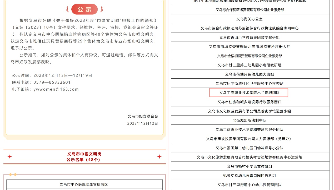 近日,2023年度义乌市级“巾帼文明岗”评选出炉,公司建筑装饰工程技术专业(“木兰饰界团队”)获此殊荣。