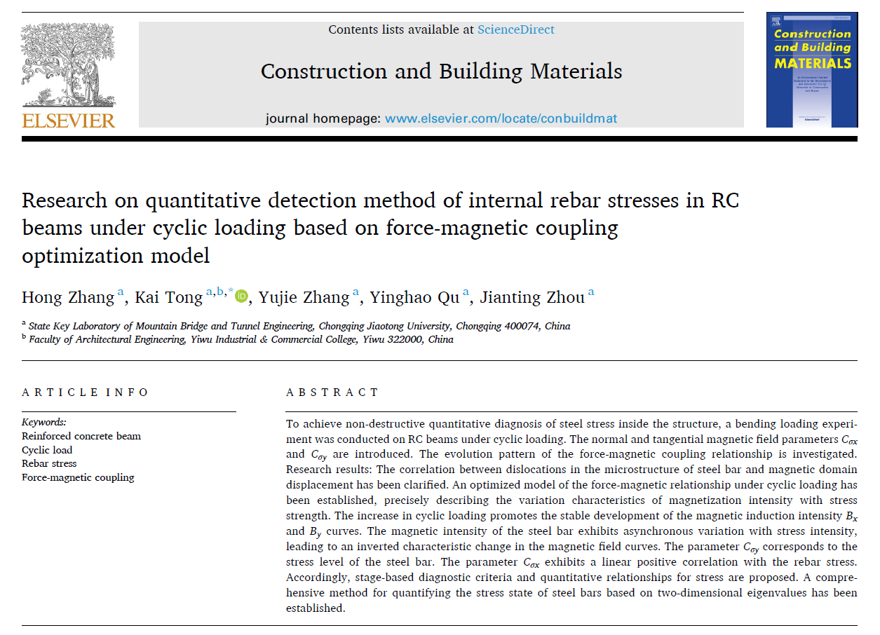 入职不到半年时间,童凯博士已展现出强劲的科研活力与育人担当,科研成果丰硕。2025年12月,其申报的《基于弱磁激励磁化效应的桥梁结构钢筋力磁耦合机理与应力诊断方法研究》项目成功获批浙江省自然科学基金青年科学基金项目立项。该项目聚焦桥梁结构应力无损检测前沿问题,融合力磁耦合理论与弱磁激励技术,旨在为提升义乌城市交通基础设施的智能化监测水平提供原创性理论支撑与技术路径。2025年11月,童凯联合重庆交通大学山区桥梁及隧道工程国家重点实验室与义乌工商职业公司太阳成集团tyc122cc,童凯以独立通讯作者身份在土木工程领域一区TOP期刊《Construction and Building Materials》(影响因子IF = 8.0)发表学术论文《Research on quantitative detection method of internal rebar stresses in RC beams under cyclic loading based on force-magnetic coupling optimization model》,实现公司在该顶级期刊上的历史突破。该研究系统揭示了混凝土桥梁内部钢筋材料的应力场与磁场之间的物理耦合机制,为推动桥梁工程检测向多元化、精准化和无损化方向发展奠定了坚实的理论基础。