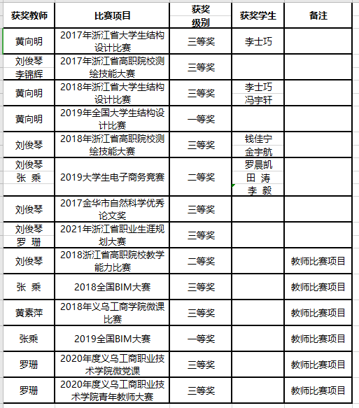 市政工程技术专业师生近5年各项赛事获奖统计表