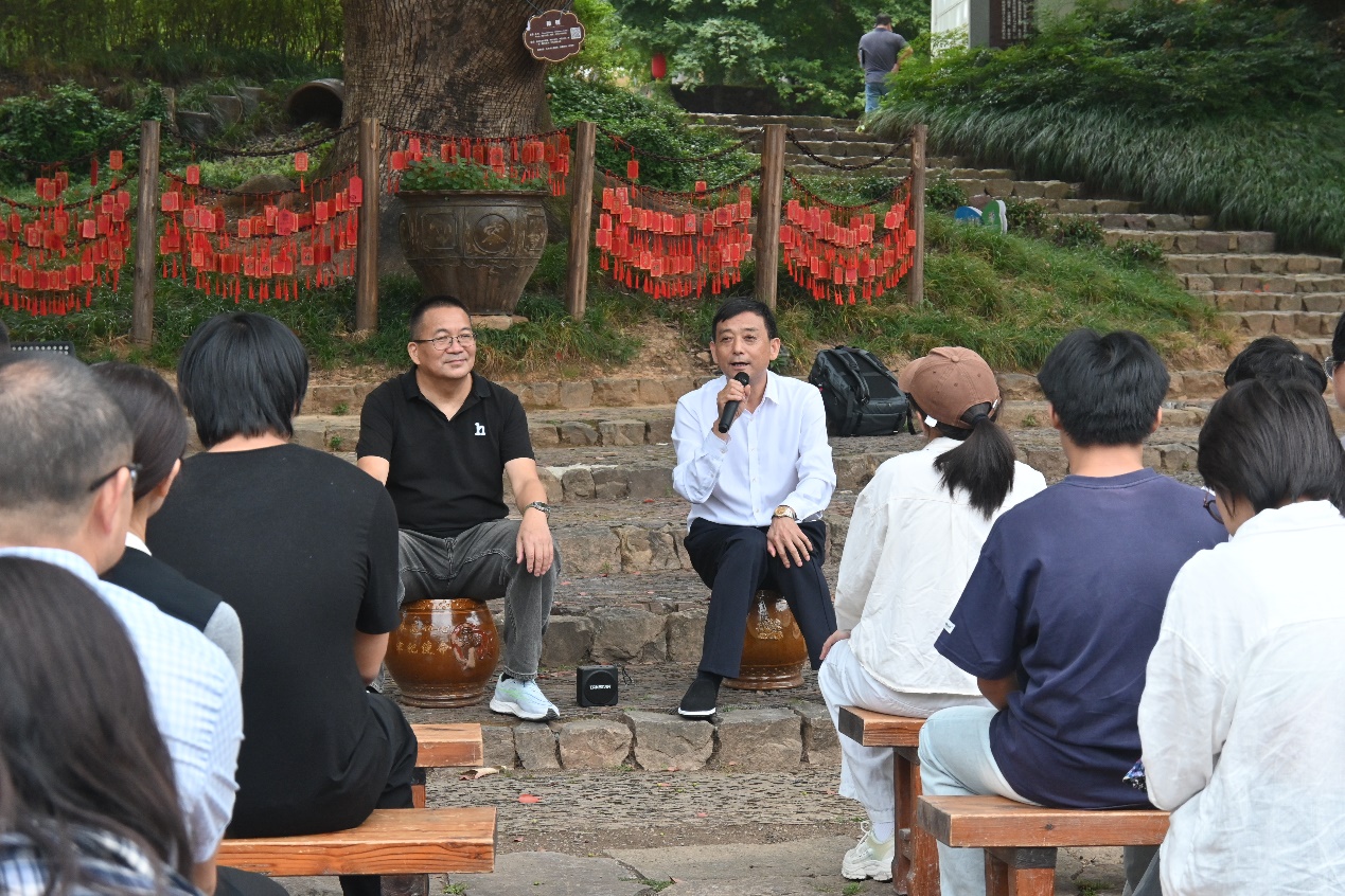 经验分享,共话未来。签约授牌结束后,陇头朱村党委书记朱根喜和缸窑村党总支书记陈跃俊分别分享了两个村庄的先进发展经验,他们通过挖掘乡村历史文化和特色产业,打造乡村品牌,大力发展乡村农业和旅游经济,不断追求乡村快速发展和村民共同富裕。分享过后,两位村书记还与员工们进行了深入交流,当被问到现阶段村庄发展面临什么瓶颈时,他们都谈到了乡村发展需要“留”下两类人,一是让前来游玩的人流连忘返,二是让前来创业的人扎根乡土。讲到动情之处,两位书记更是热烈欢迎同学们把专业所学带到两个村子的建设中,把真才实干投入到乡村振兴的发展中。