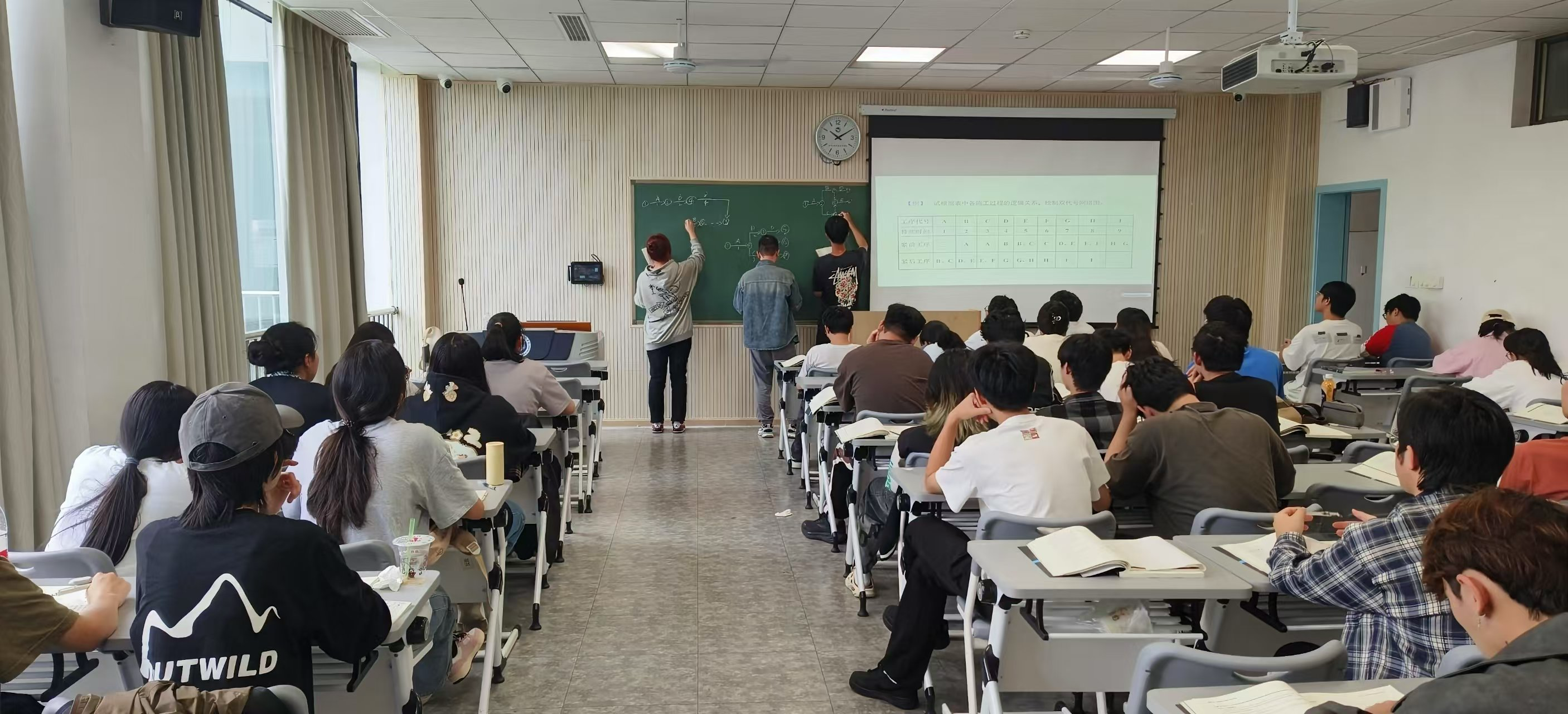 初筱老师从网络计划技术的现实应用入手,引入单代号网络计划与双代号网络计划。主要结合例题讲解了单双网络计划图的绘制规范与逻辑关系。课堂中师生互动良好,员工就单双网络计划图绘制展开讨论,并邀请多位员工到黑板上展示绘图成果,其余同学积极评价并指出问题,课堂氛围活跃。